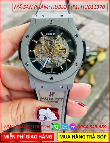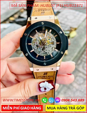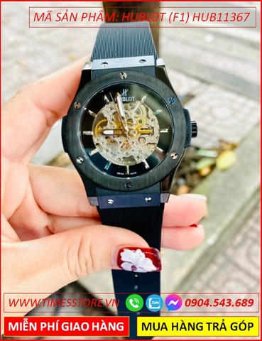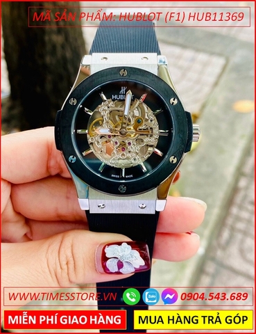 Đồng Hồ Nam Hublot F1 Automatic Mặt Tròn Đen Lộ Cơ Dây Da Nâu Bọc Silicone (42mm)