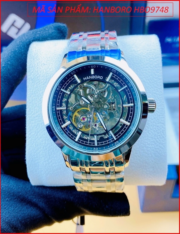 Đồng Hồ Nam Hanboro Automatic Mặt Đen Lộ Cơ Dây Kim Loại (40mm)