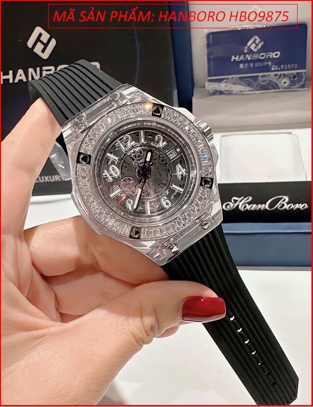 Đồng Hồ Nam Hanboro Automatic Mặt Tròn Đính Đá Dây Silicone (43mm)