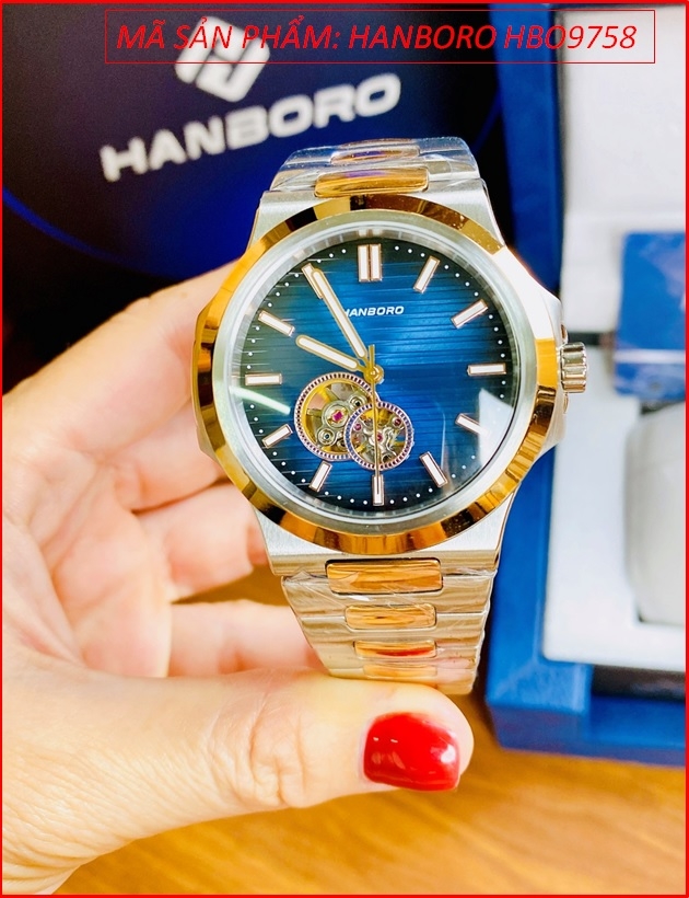 Đồng Hồ Nam Hanboro Automatic Mặt Tròn Xanh Dây Kim Loại Demi (42mm)