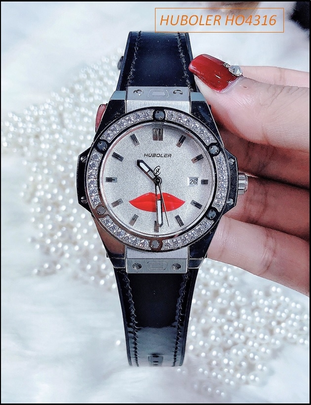 Đồng hồ Nữ Huboler Đôi Môi Đỏ Mặt Trắng Dây Silicone Đen